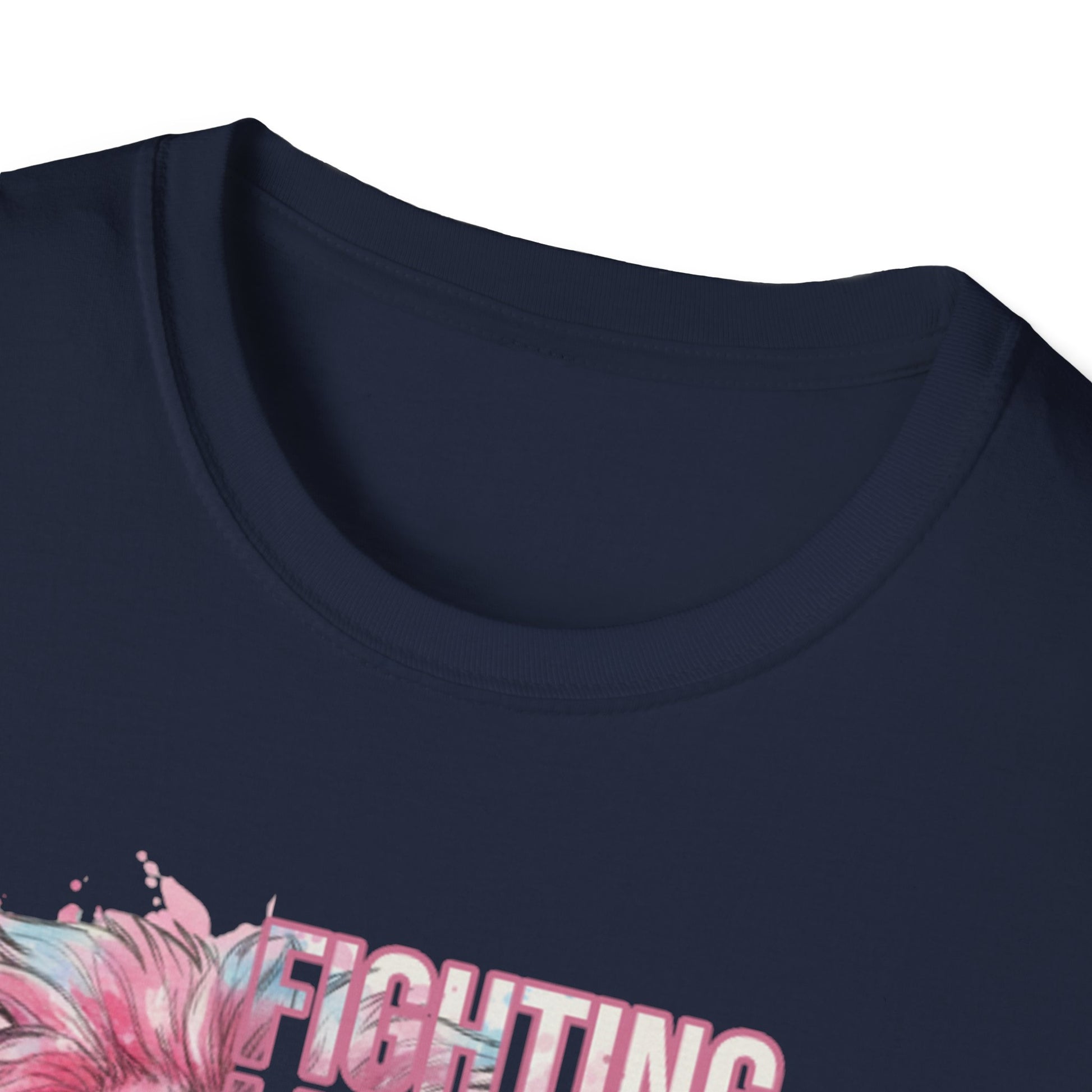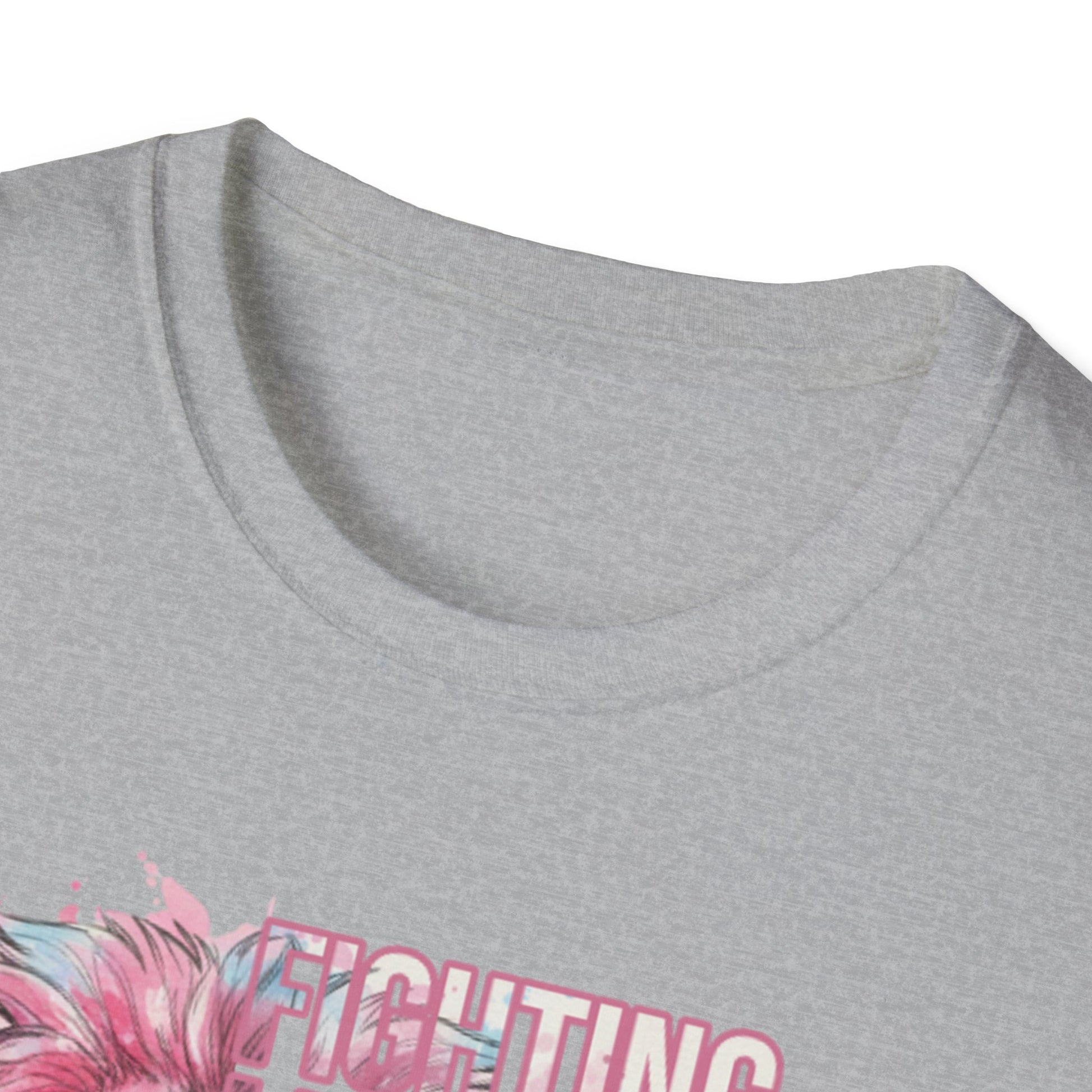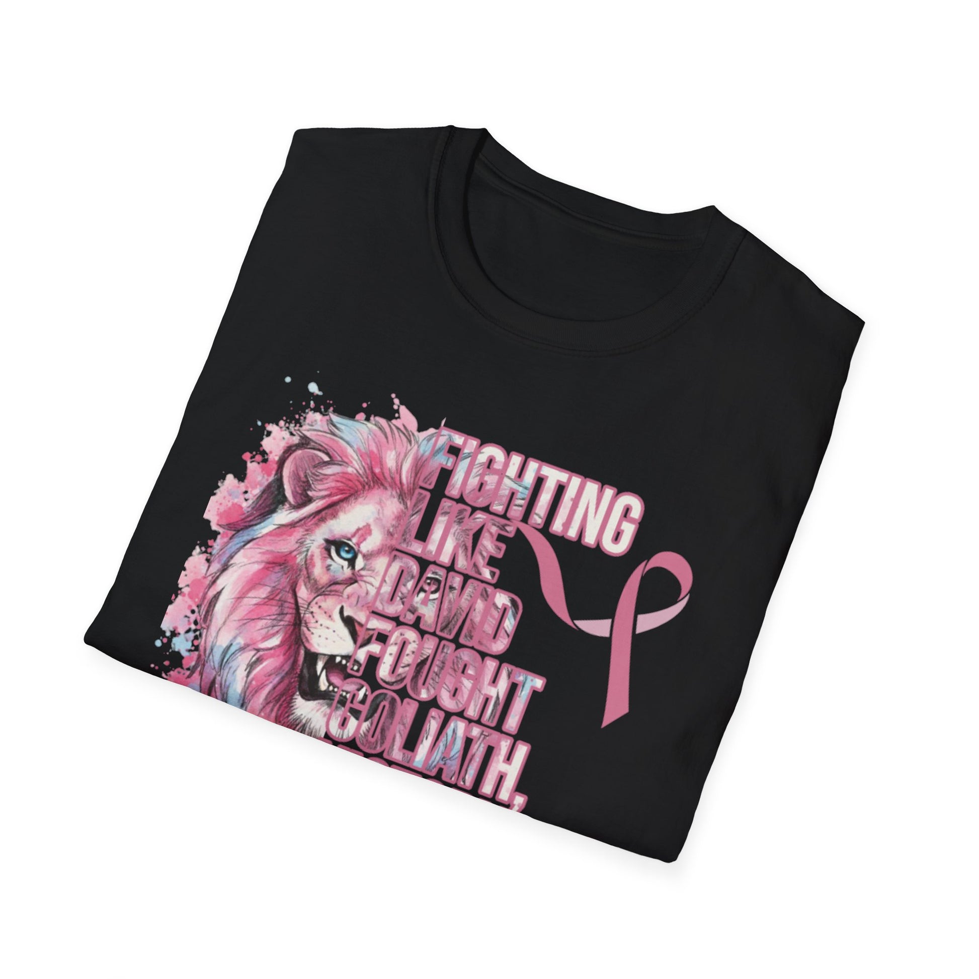 This lightweight crewneck tee carries quiet strength — a soft, breathable cotton canvas printed with a watercolor-style pink lion and breast cancer awareness accents. The front pairs a fiercel y gentle lion portrait with an encouraging, faith-forward phrase and a subtle awareness ribbon. The back features the lion again above a bold “WARRIOR” bar, finished with small ribbon motifs. Wear it to show solidarity, to honor a survivor, or to bring gentle courage to everyday moments. The fabric drapes easily, holds printed detail well, and keeps you comfortable from casual days to fundraising walks.